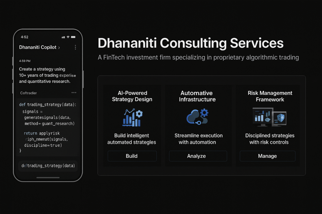 Dhananiti Consulting Services is a FinTech investment firm specializing in proprietary algorithmic trading. Our mission is simple — to help investors grow their capital through intelligent, data-driven strategies.